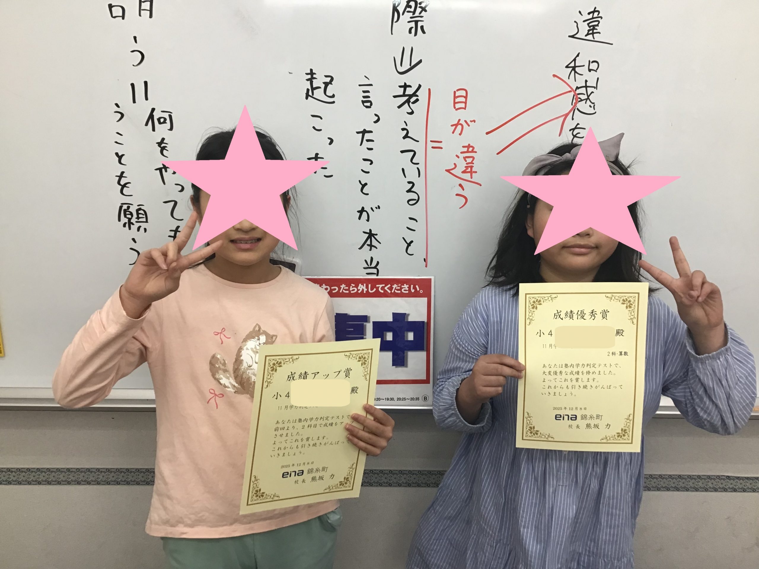 本日、学力判定テストの結果の返却日でしたが、欠席者が多かったため、別日返却します。なので、本日は表彰状を持たせての記念撮影は後日とします。