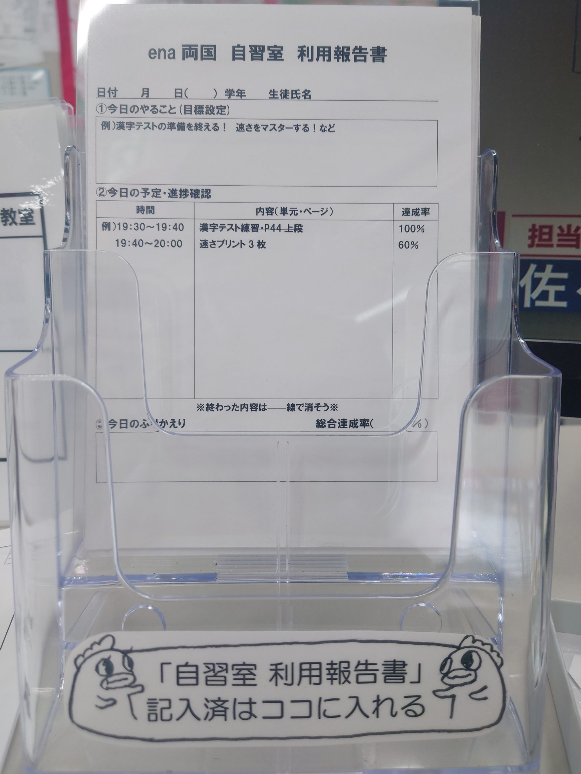 ena両国では、自習室使用時に「自習室利用報告書」を記入し提出をしてもらっています。