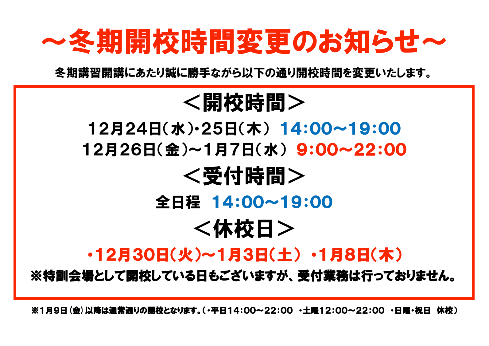 12月24日(水)からの冬期講習開講に伴い、