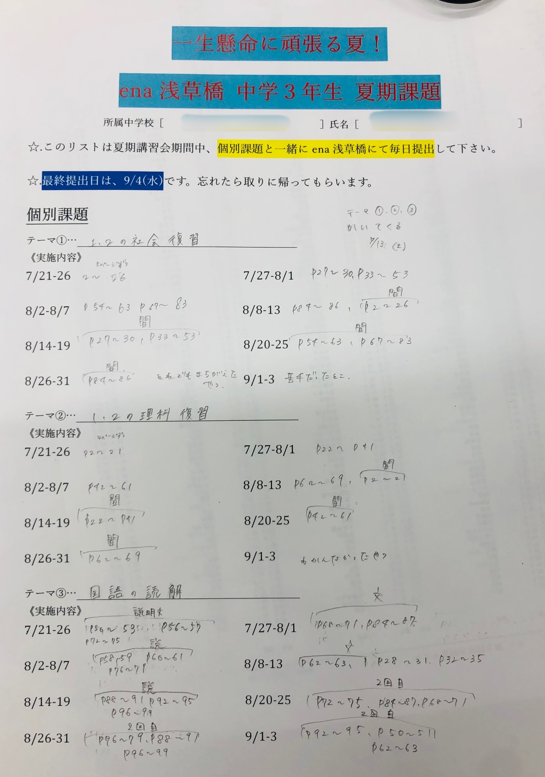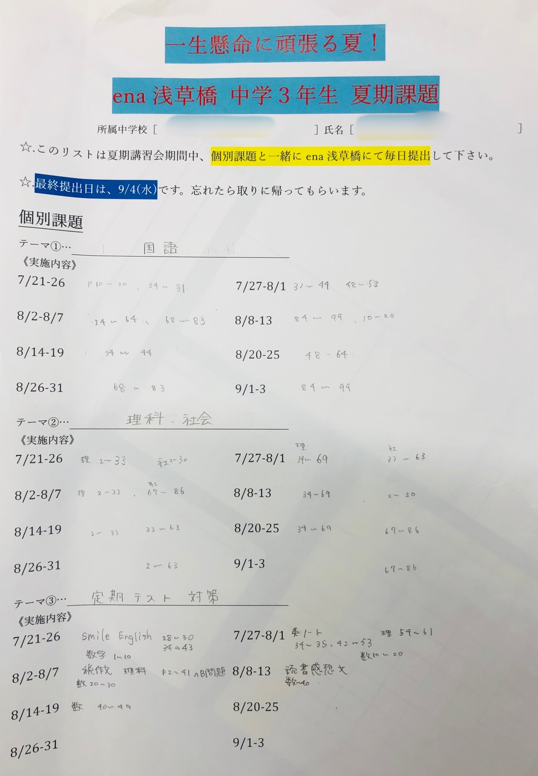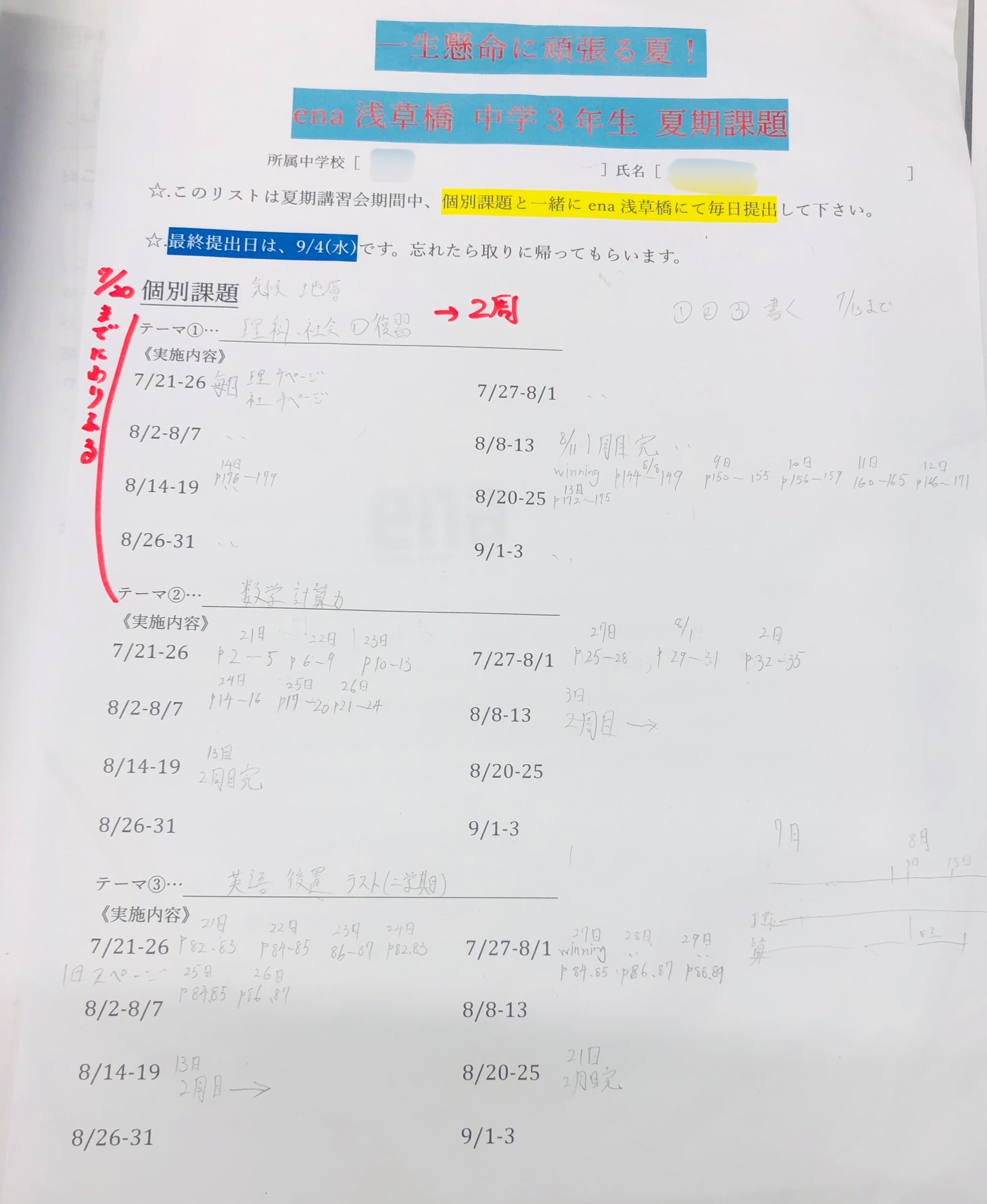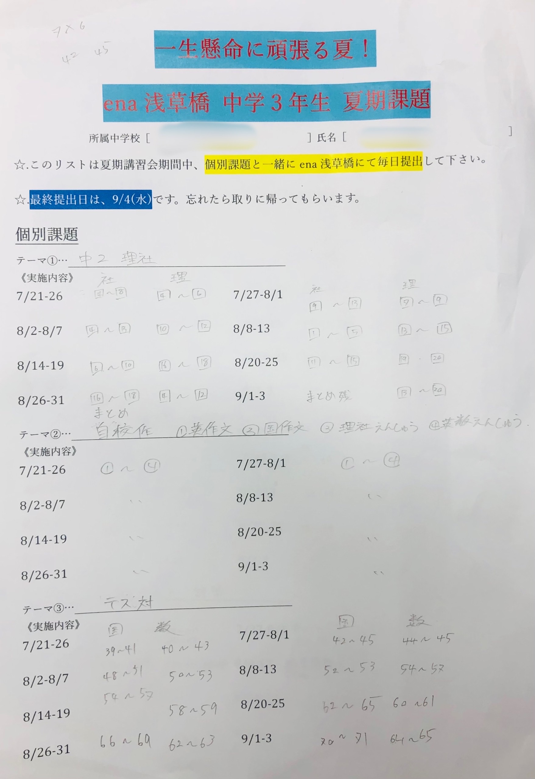 夏期講習会期間に入る前、中学3年生の子どもたちと1:1で生徒面談を行う機会を設けました。そこで各々が今夏に取り組むべきことについてじっくりと煮詰めていき、それを夏期講習会期間中にどう進めていくべきかを計画しました。