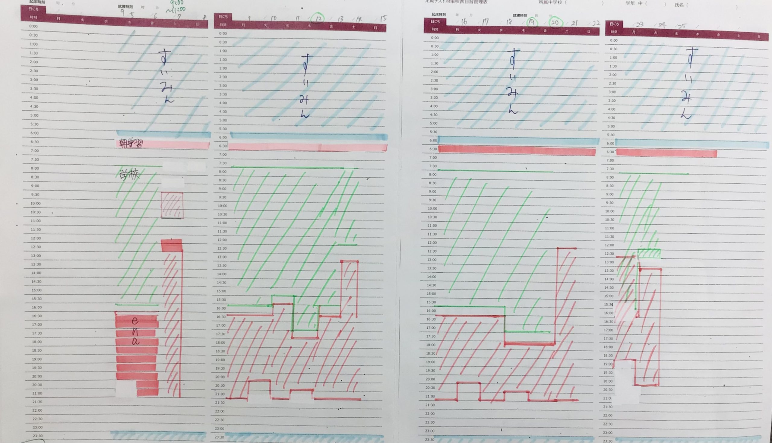 先を見越すということで、中学3年生の子どもたちに定期テスト対策校舎自習管理表を作成してもらいました。どこで学習時間を捻出・確保できるか、その見通しをまずはしっかりと持ちます。そうすることにより、各タイミングで何をどう実施するべきかを当てはめられ、効率性に富んだ繋がりのある学習ができます。