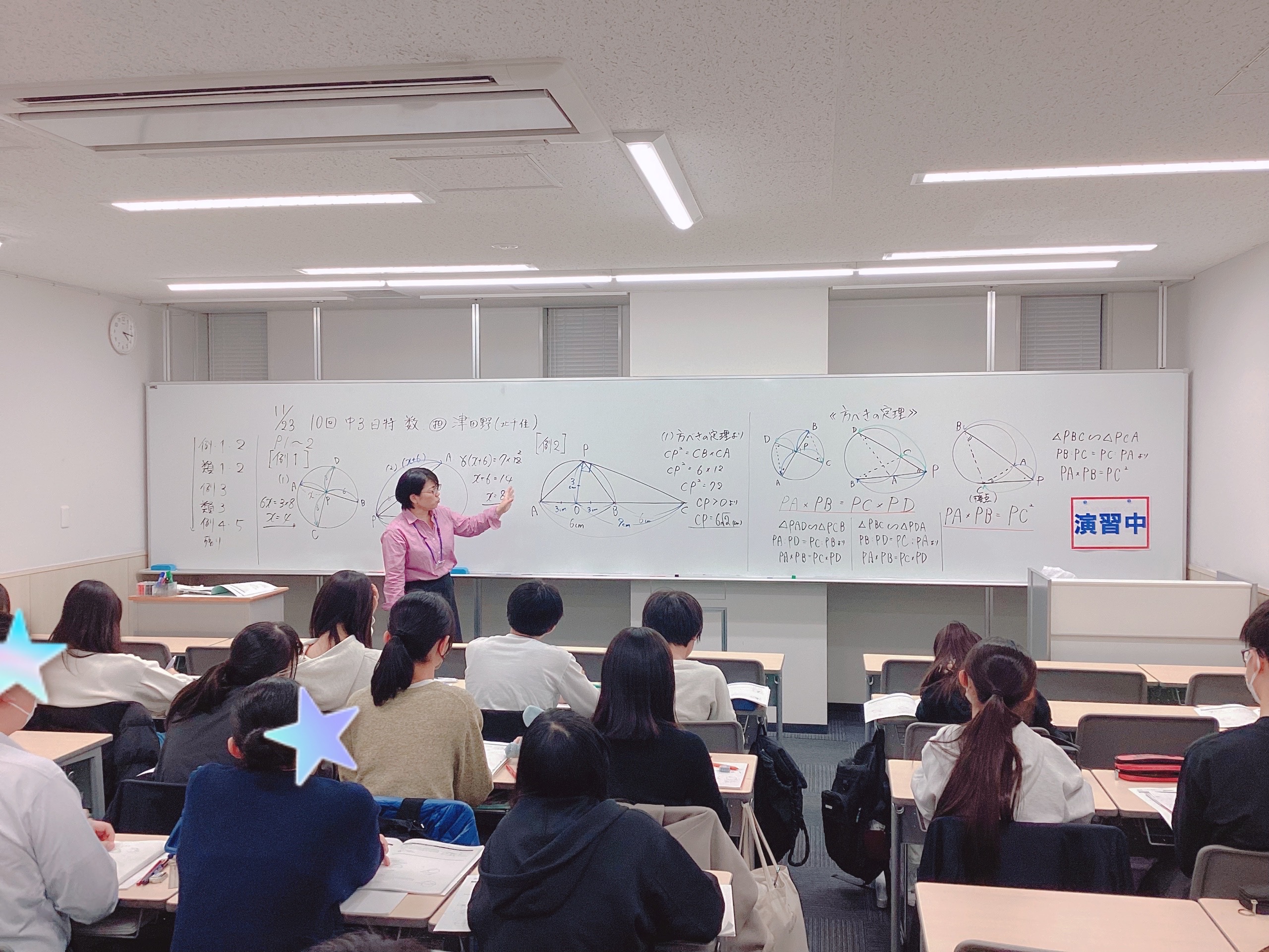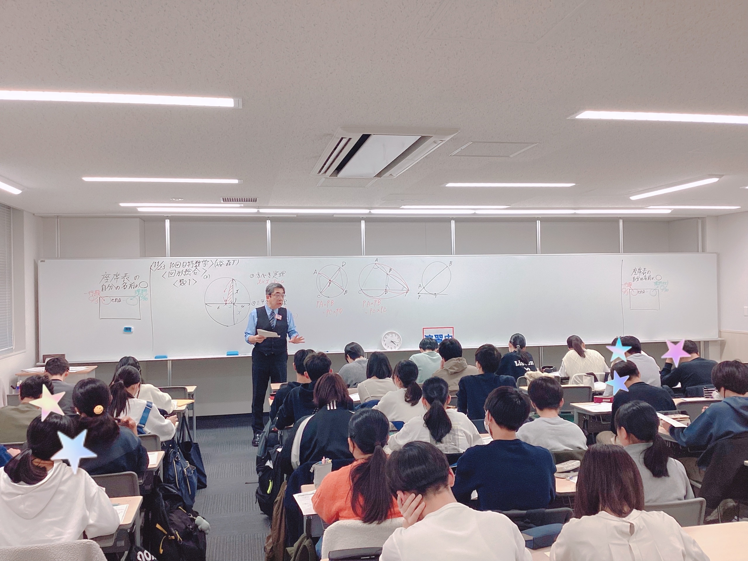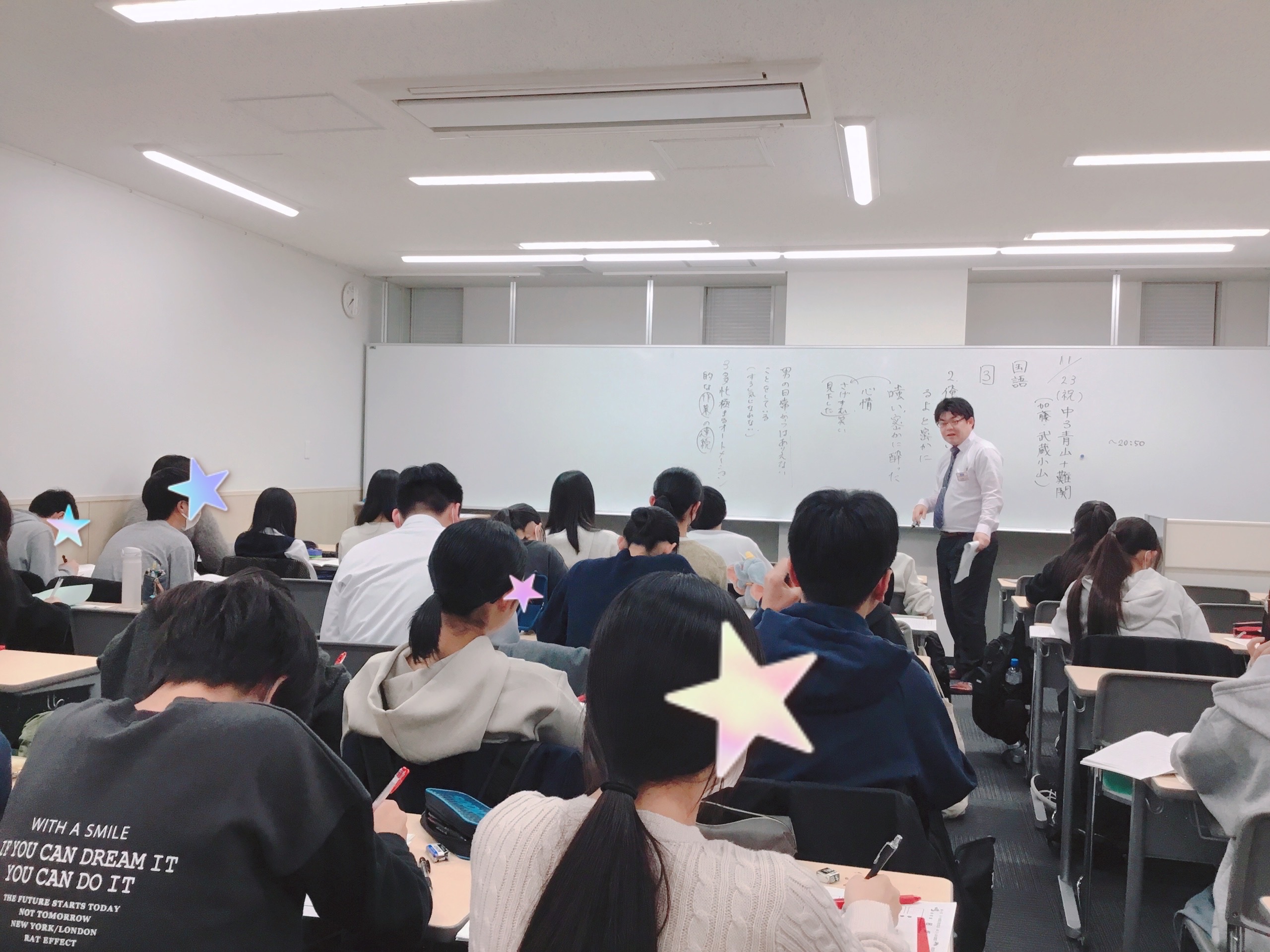 11月23日(土祝)では、私も国語を担当いたしました。特に大問3の文学的文章及び大問4の説明的文章がなかなかに骨のある問題で、上位校レヴェルならではの視点や考え方・導き方などを、結構な時間をかけて解説していきました。
