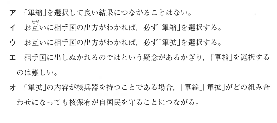 このように、表の内容を整理してみると、両国が軍縮を選択するのは理想的ではあるものの、実際には相手国がどちらを選ぶかは分からないので、自国が軍縮を選択することが難しいと考えることができます。