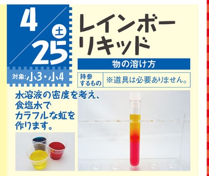校舎の元気印、田代先生といっしょに楽しく理科をお勉強。試験管の中に虹を描くべく、奮闘していました。