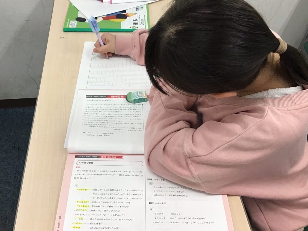 早く来た生徒たちは漢字プレテストに取り組みます。