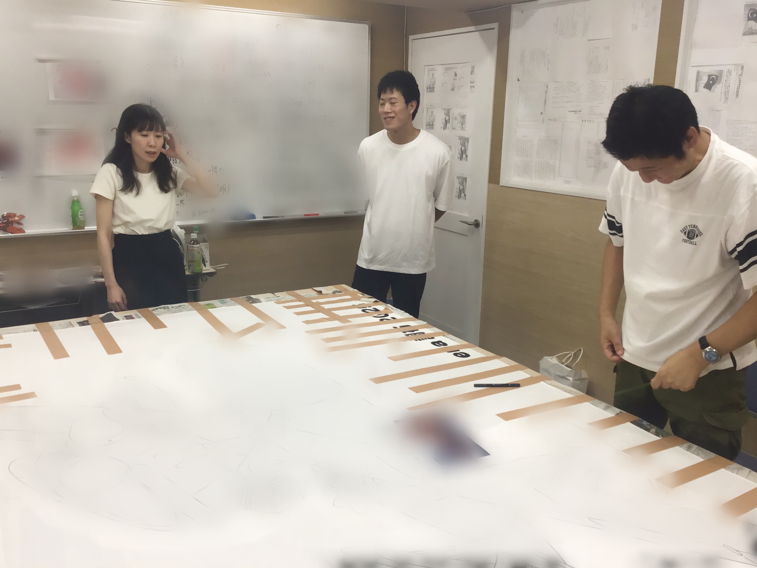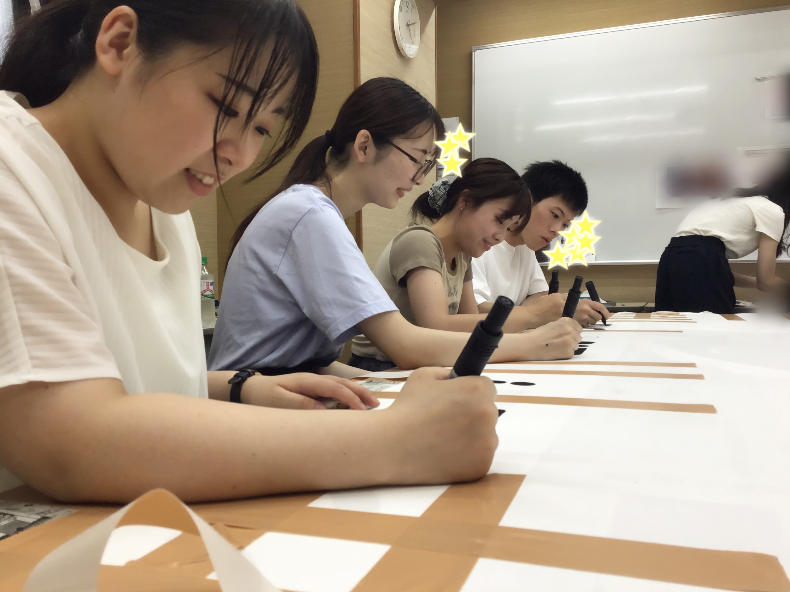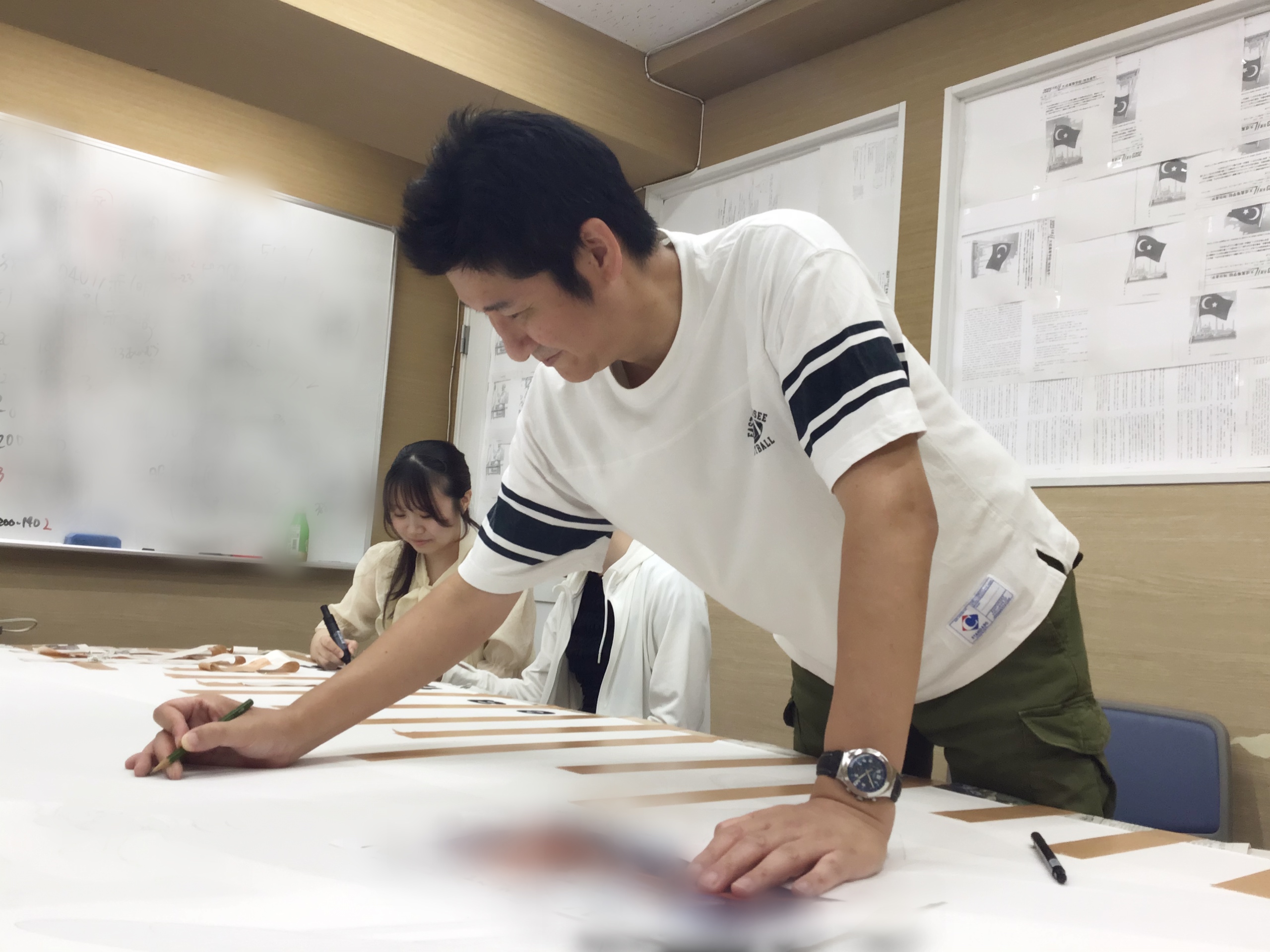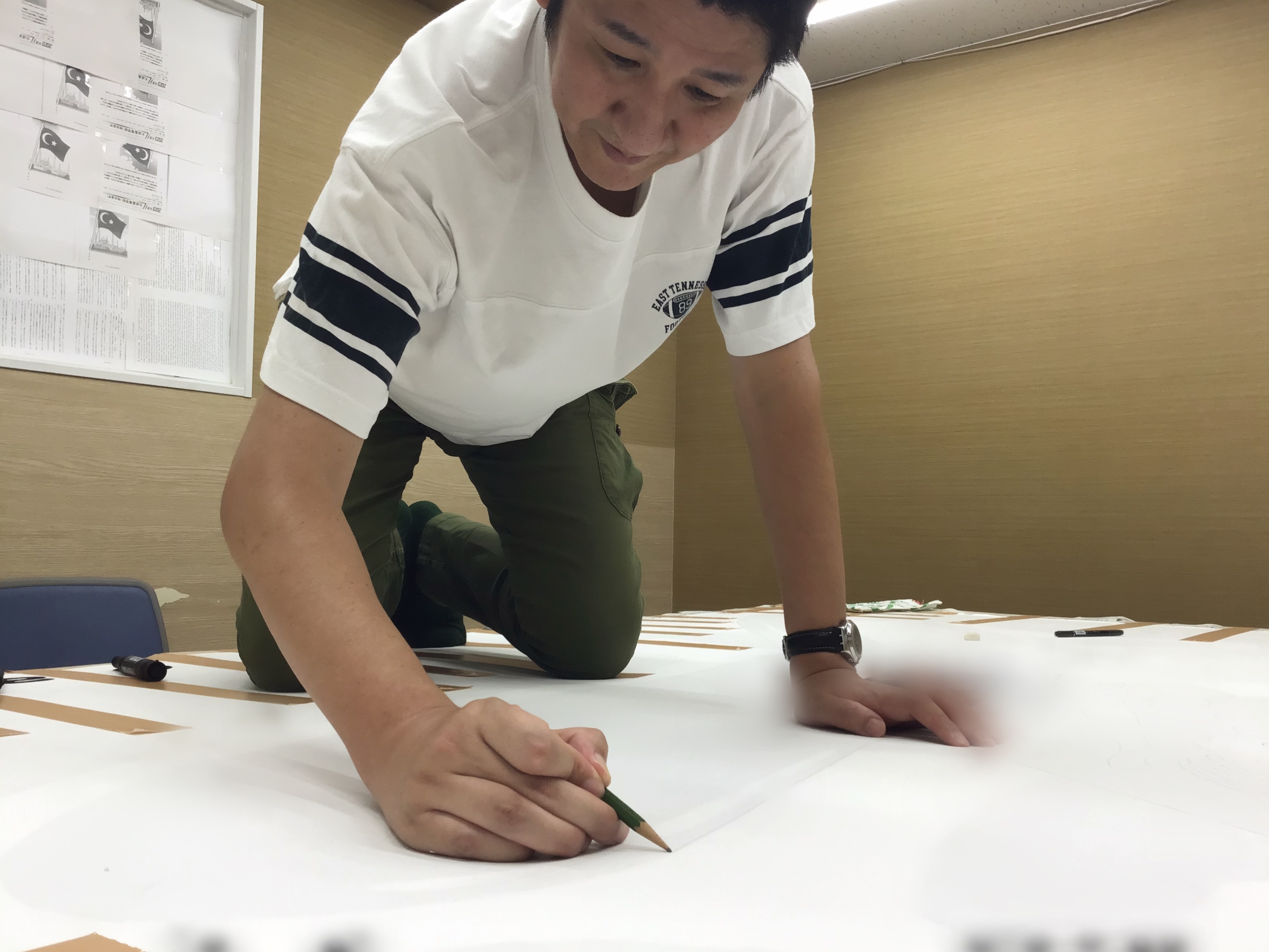 下準備を終え、教師チームはモチーフの上部のフレーズと右下に入る「ena調布2025」を書きます。