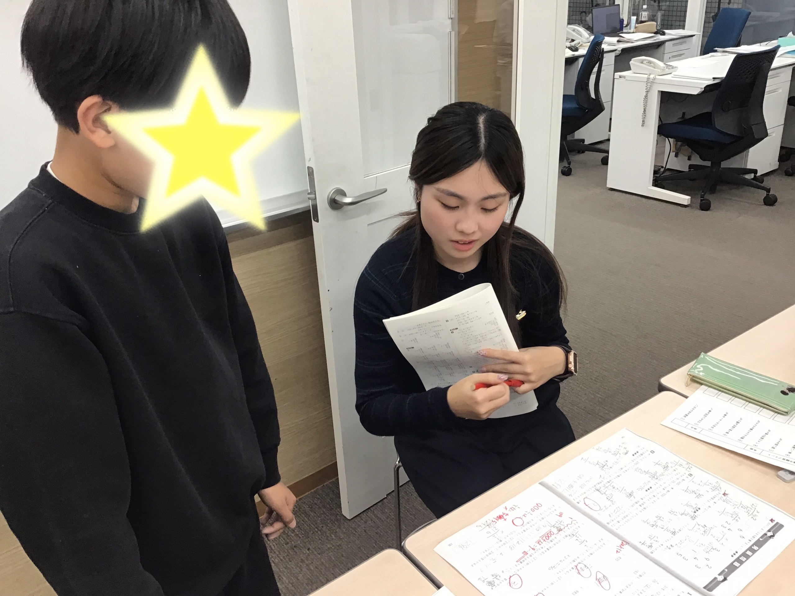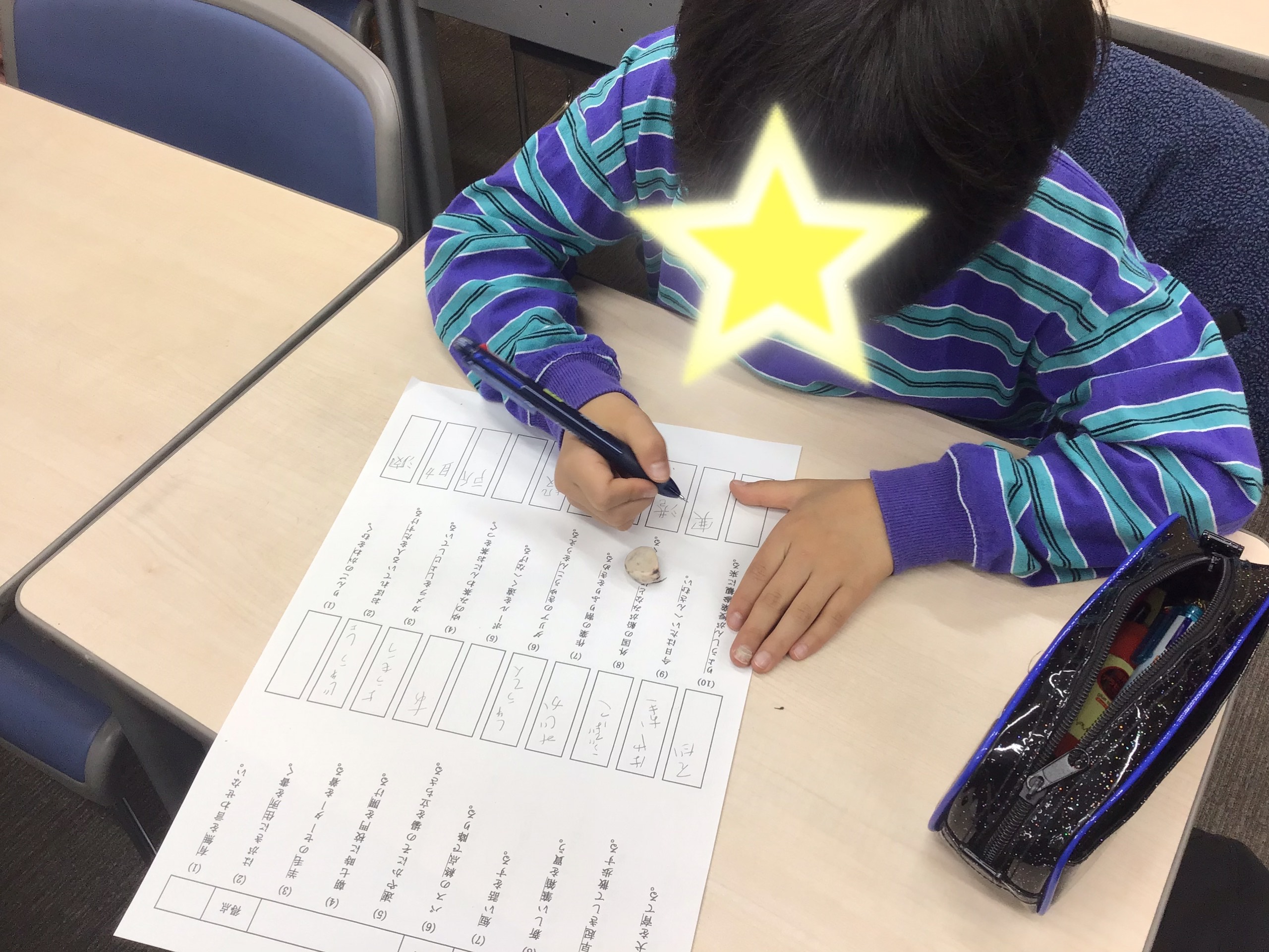 教師が用意した漢字のプリントで、本日の漢字テストの範囲を最終確認しています。