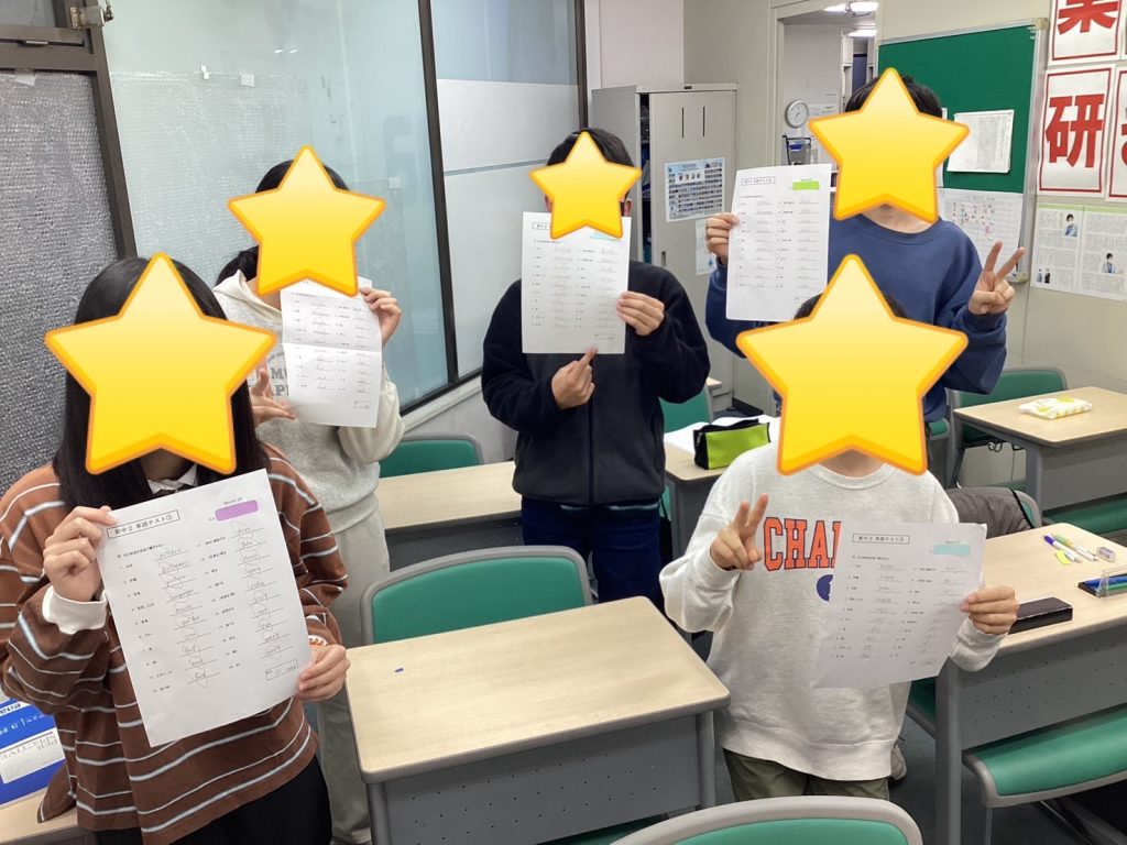 英単語テストの結果です。なんと毎回全員満点!さすがですねぇ。記念にみんなで撮りました。
