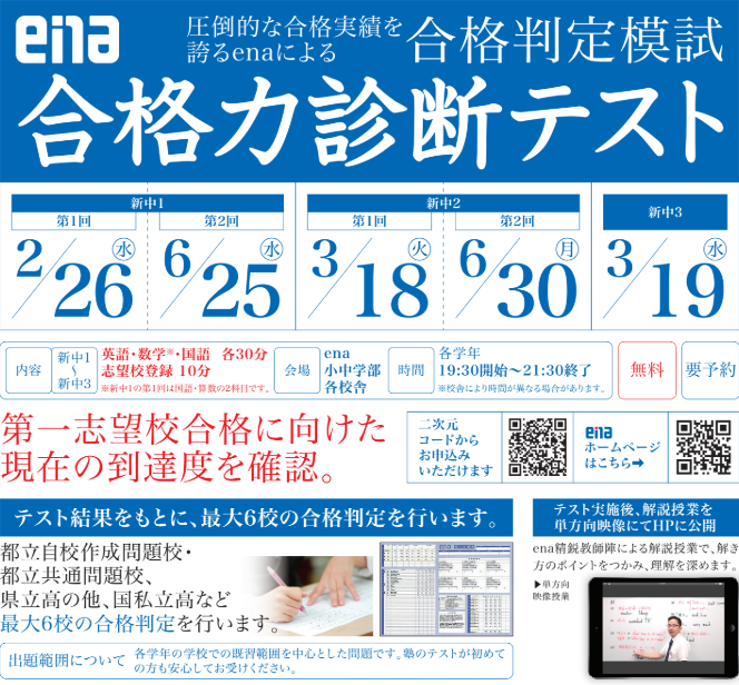 圧倒的な合格実績を誇るenaで行う中学生の模試になります。