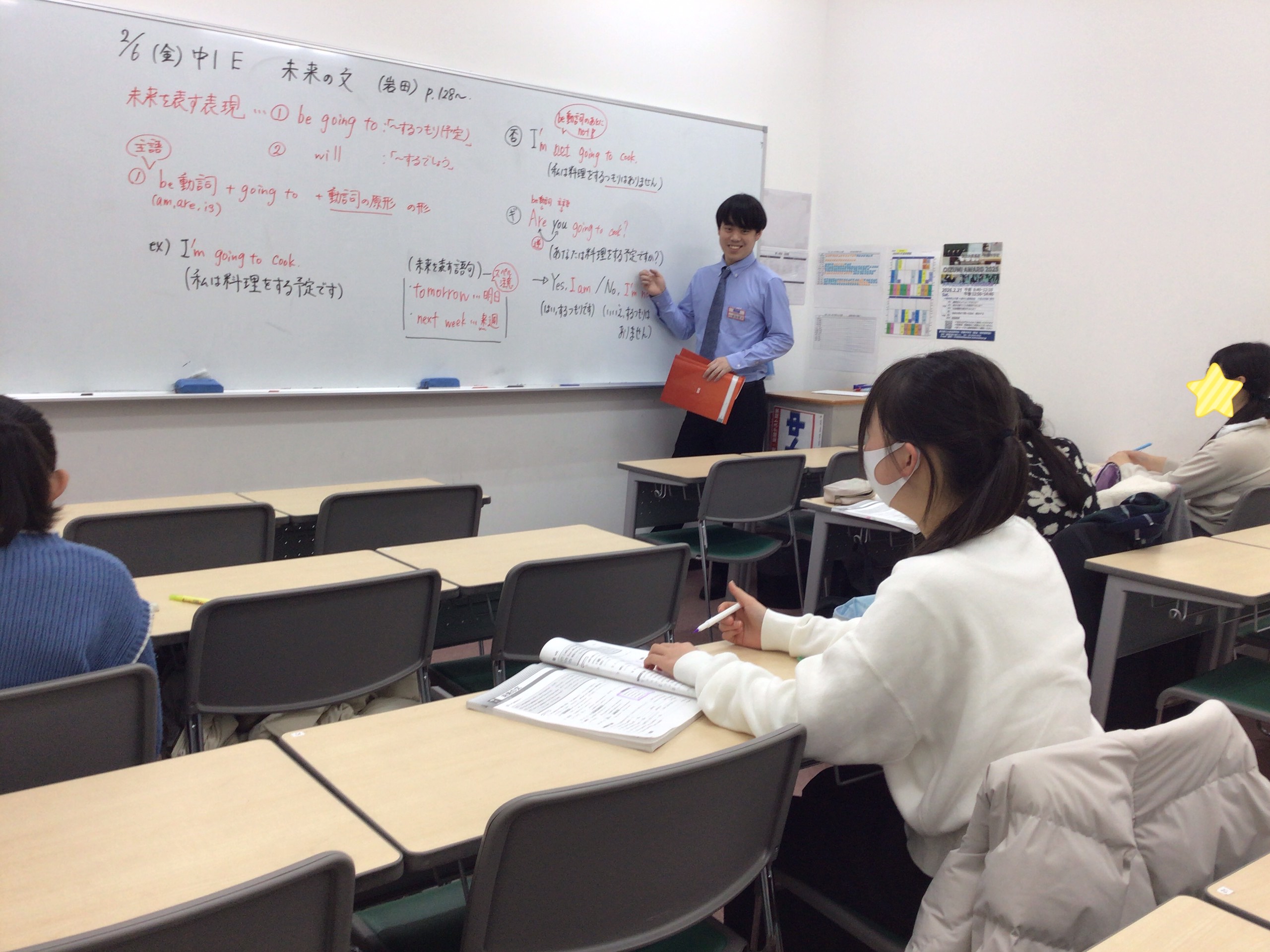 中学1年生の英語の様子です。今回は未来の文を扱いました。will とbe going to のニュアンスの違いなども紹介しながら文の作り方を勉強しました!