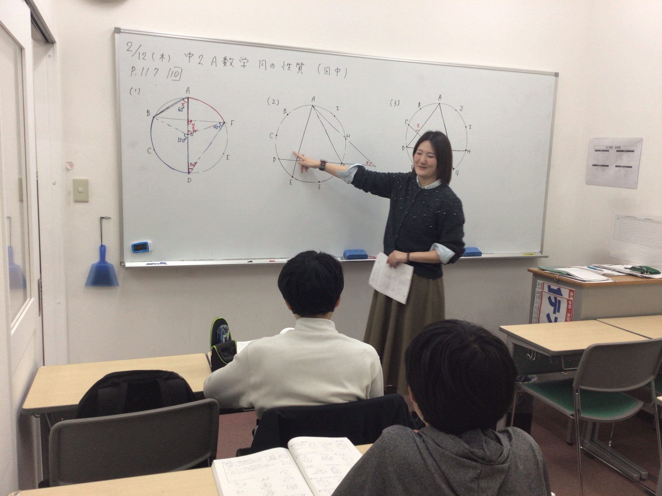 続いて中学2年生通常クラスの数学の様子です。円の性質について勉強!わかる角度から求めていき、答えを導きましょう!