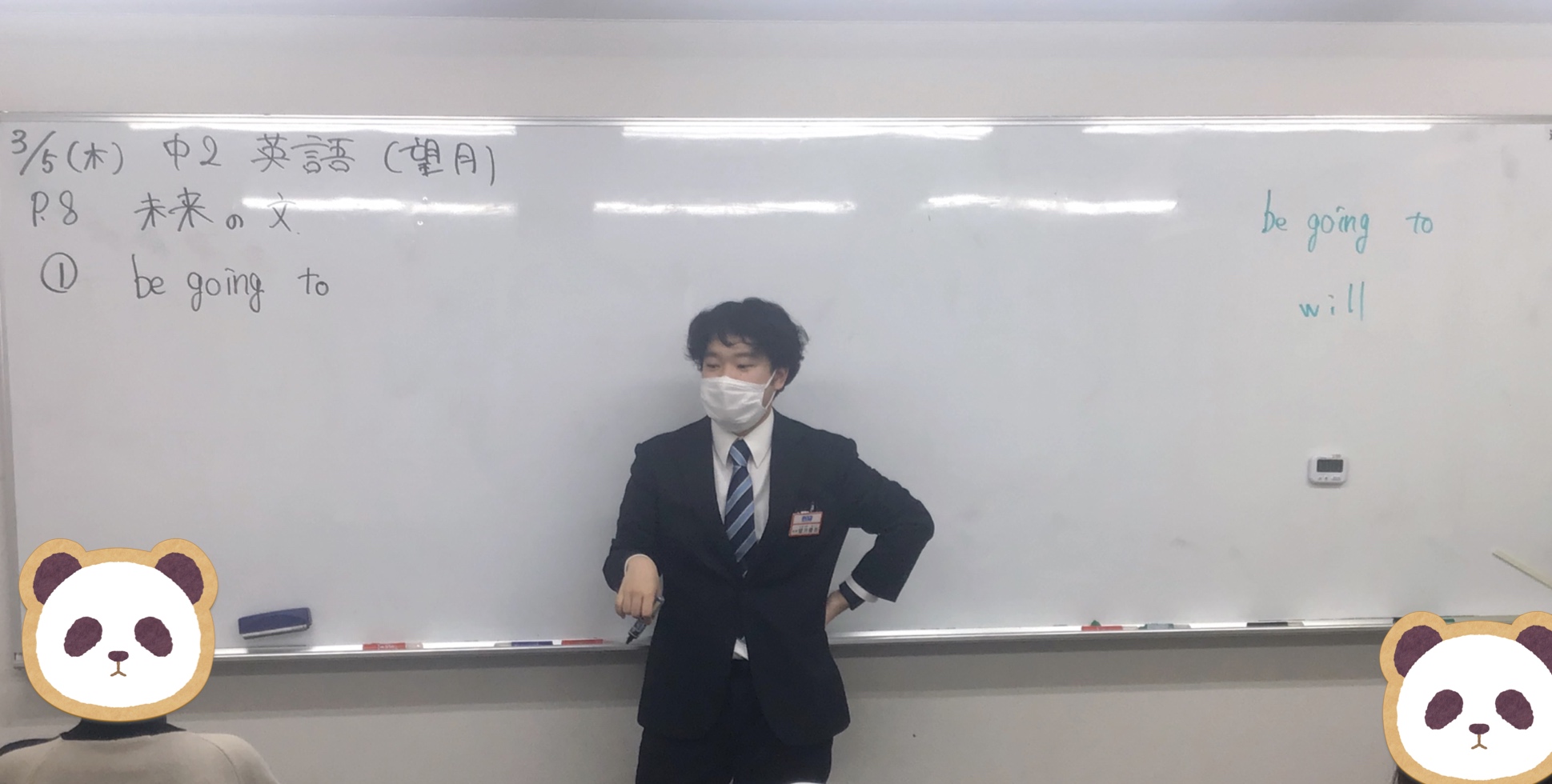 ▼中2英語担当の望月先生が丁寧に新出文法を説明しています。既習事項である現在形・過去形等の時制と関連させながら学習することで、知識の定着を図ります。