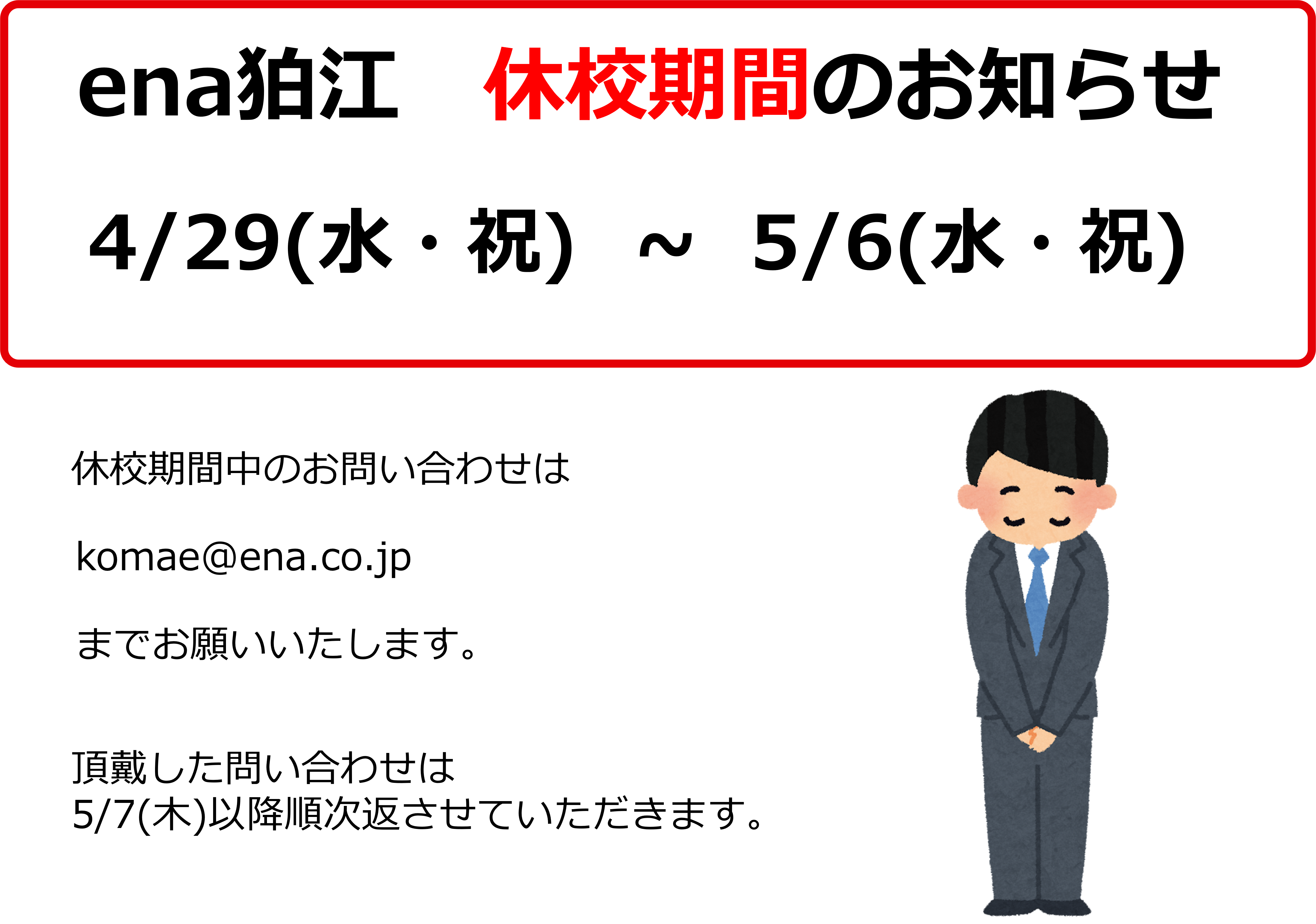 休校期間中に頂戴した問い合わせは,5/7(木)以降に順次返させていただきます。
