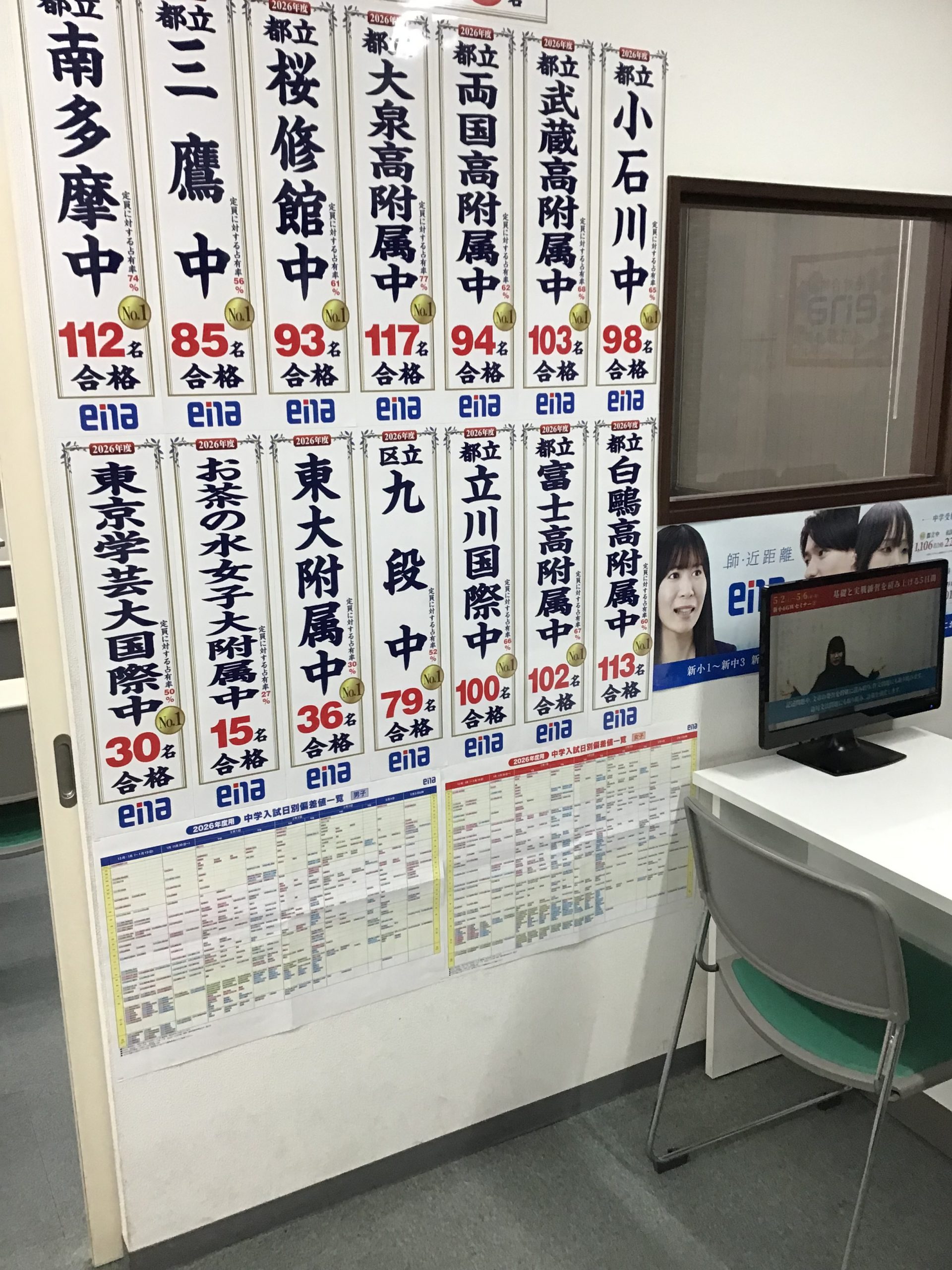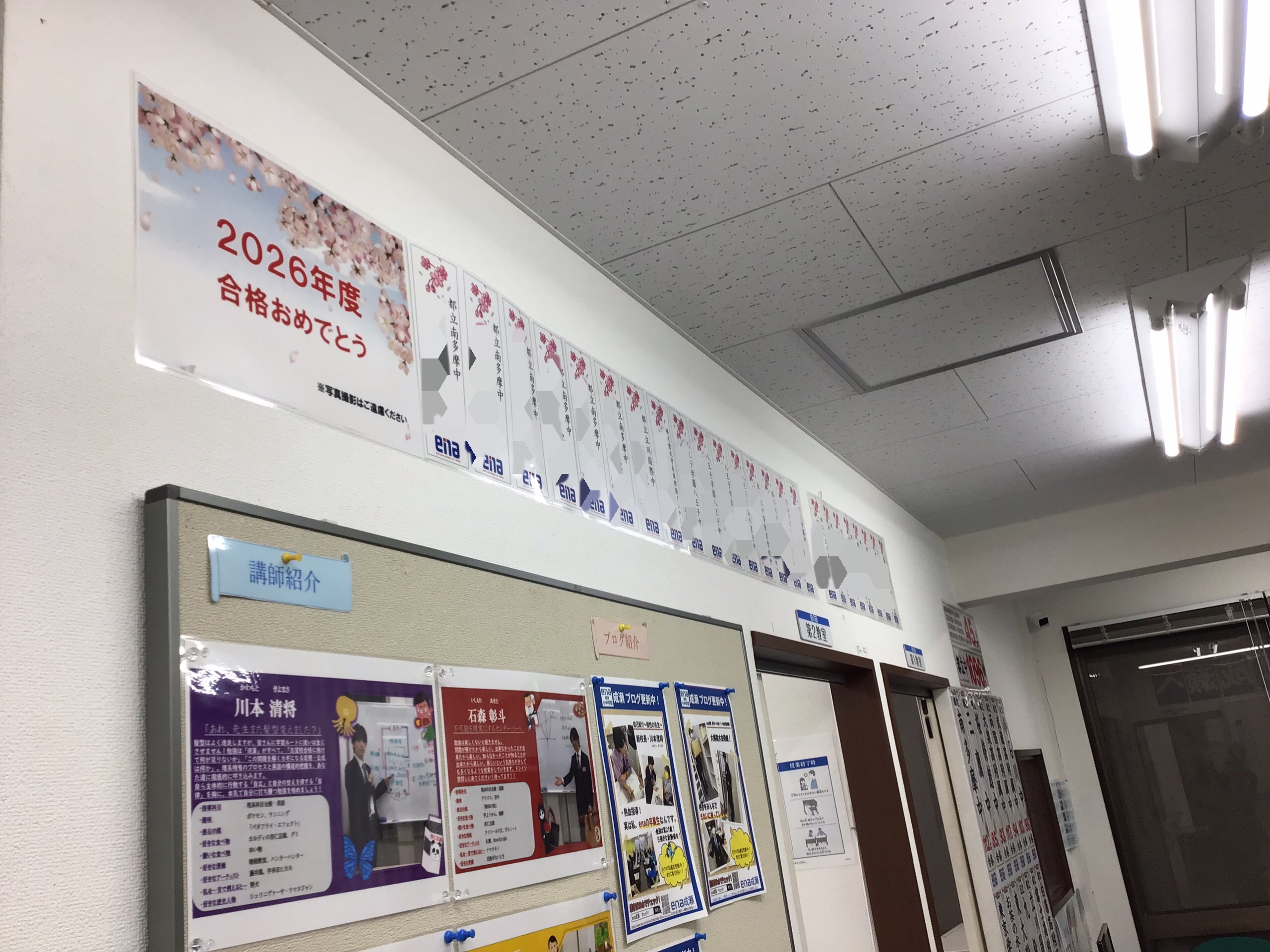 教室内部にはいたるところに合格短冊が貼られています。ena全体のものと校舎の固有名詞ベースのもの。