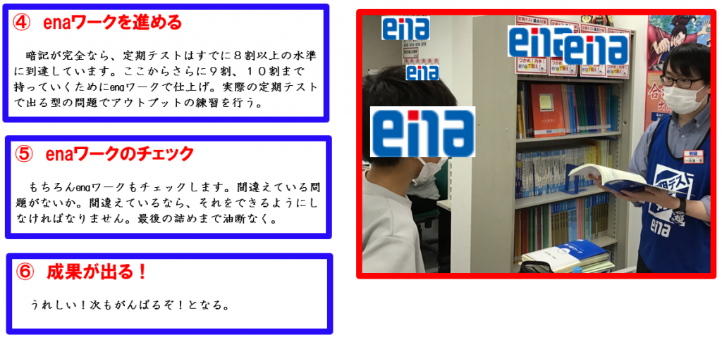 ena鶴川では、定期テストスタートの2週間前から通常授業のカリキュラムをいったんストップし、定期テスト対策にシフトします。
