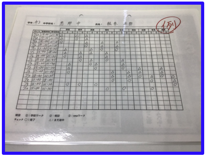 生徒の皆さん一人ひとりに上の表をつくり、テスト対策で登塾するたびに進捗を聞いて確認し、その後の反省会などで利用します。
