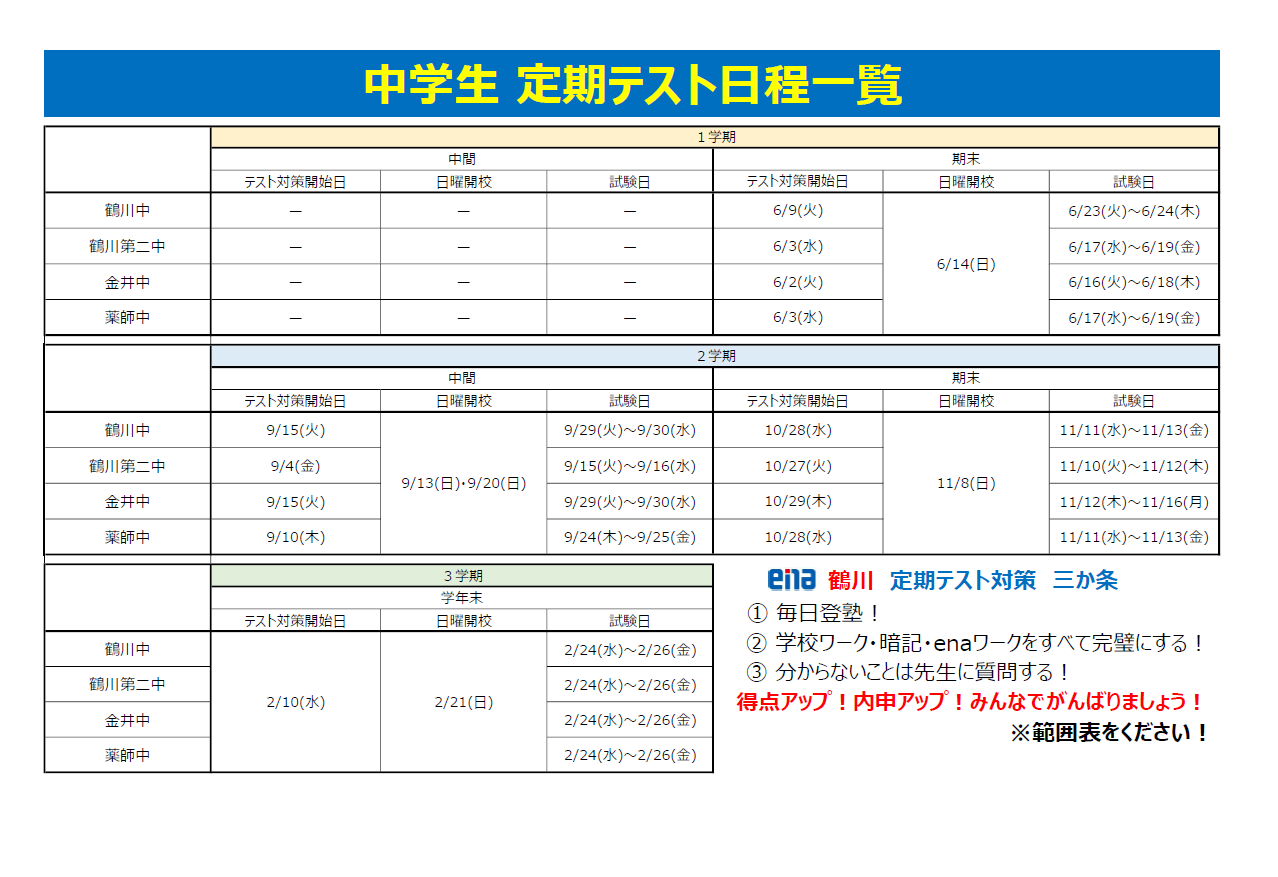 今年度の定期テスト対策の日程ができました。