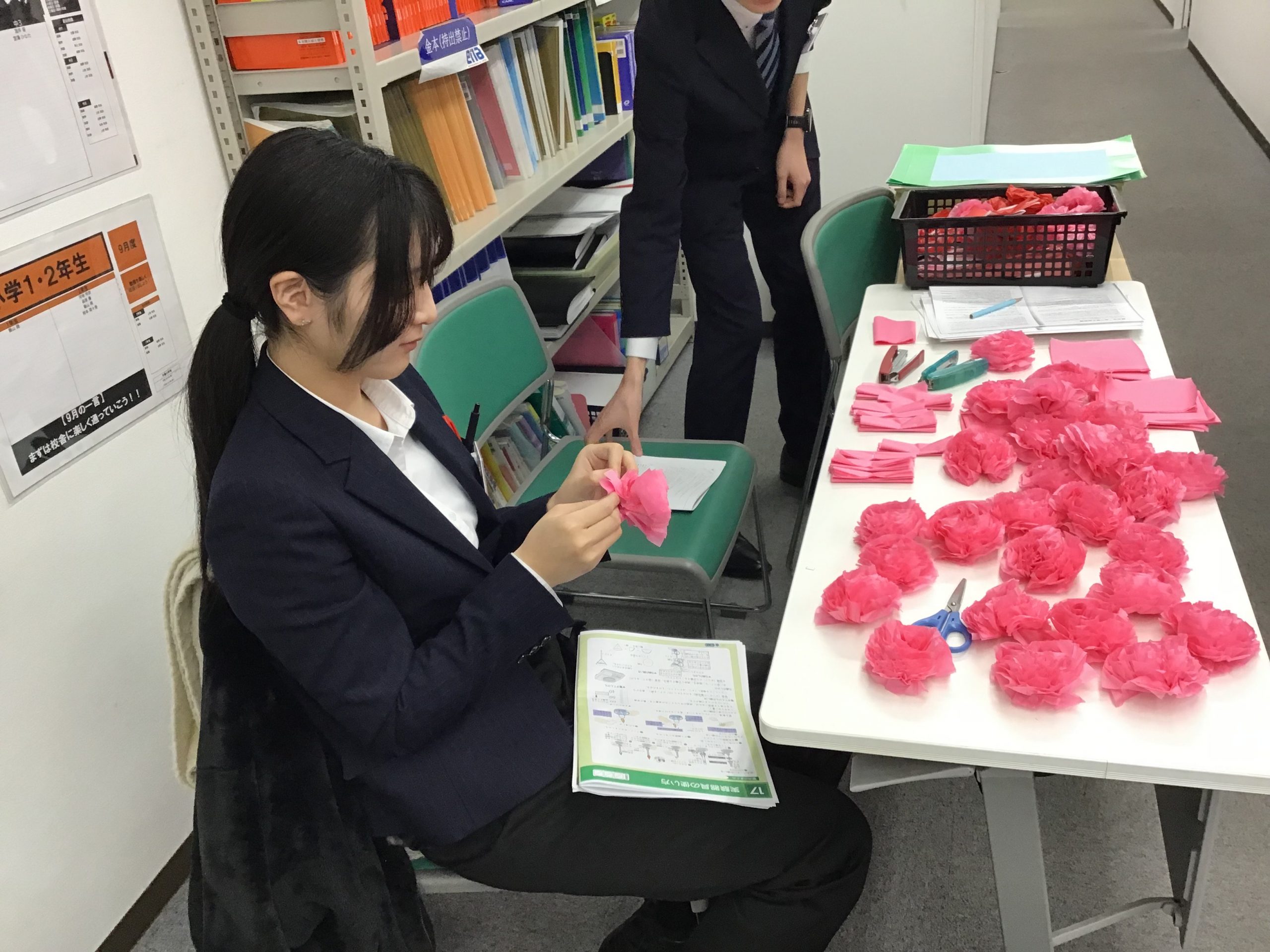 ▲合格の花飾り制作中!団結旗制作で活躍いただいた荒井先生!今回も大活躍!机の上に花がたくさん!