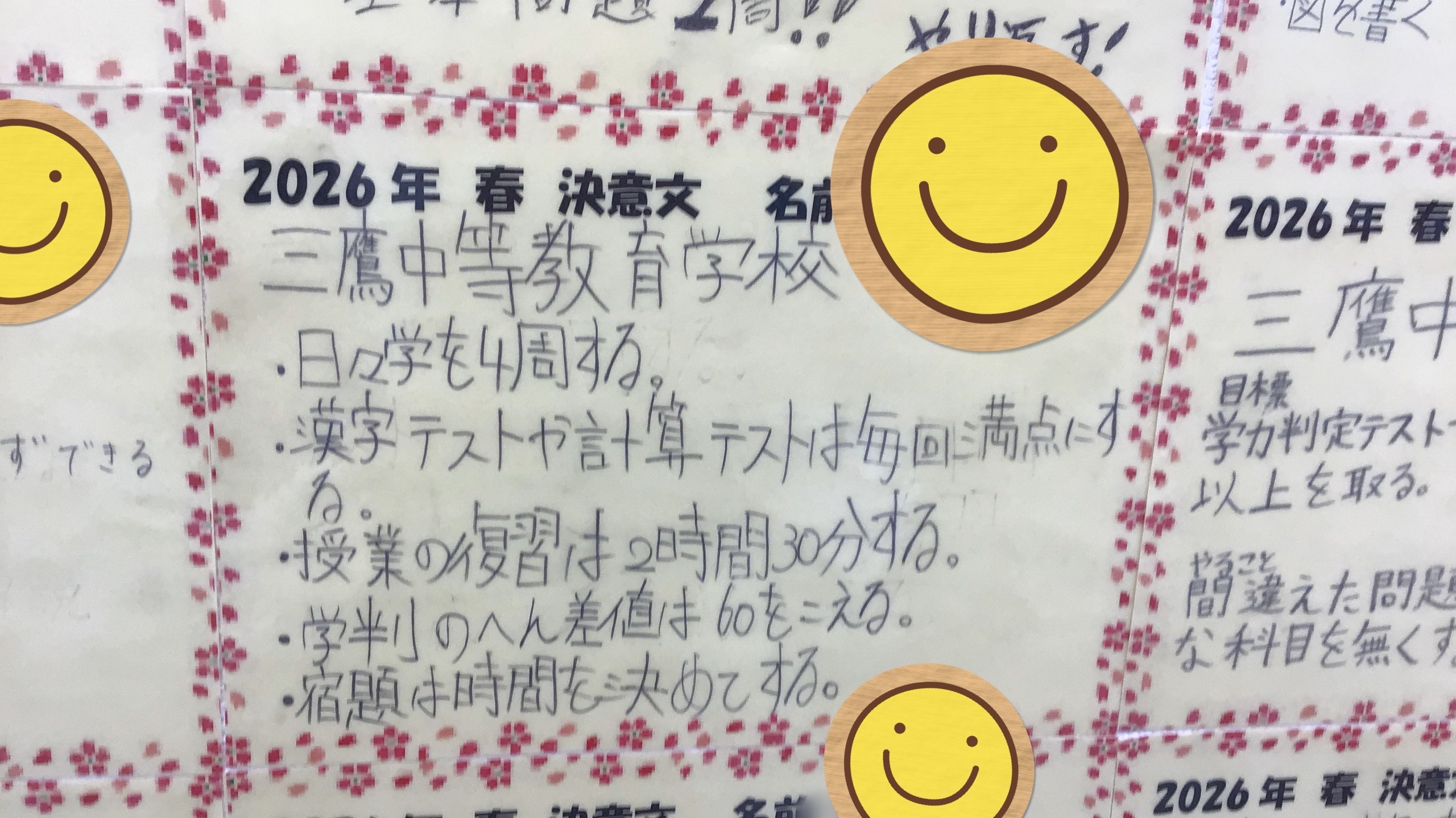 ▲新小学6年生 決意文 第1志望に向けての決意を年度初めに書いていただき、校舎にて掲示しています!みんな具体的にやること書けていてバッチリ!