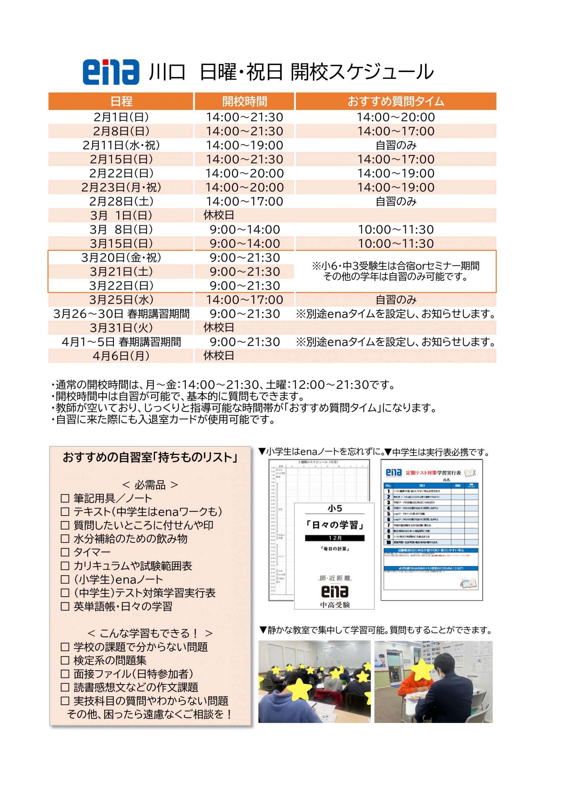 「休日に集中して勉強したい」という声に応え、日曜・祝日も開校を実施している時間を明記。