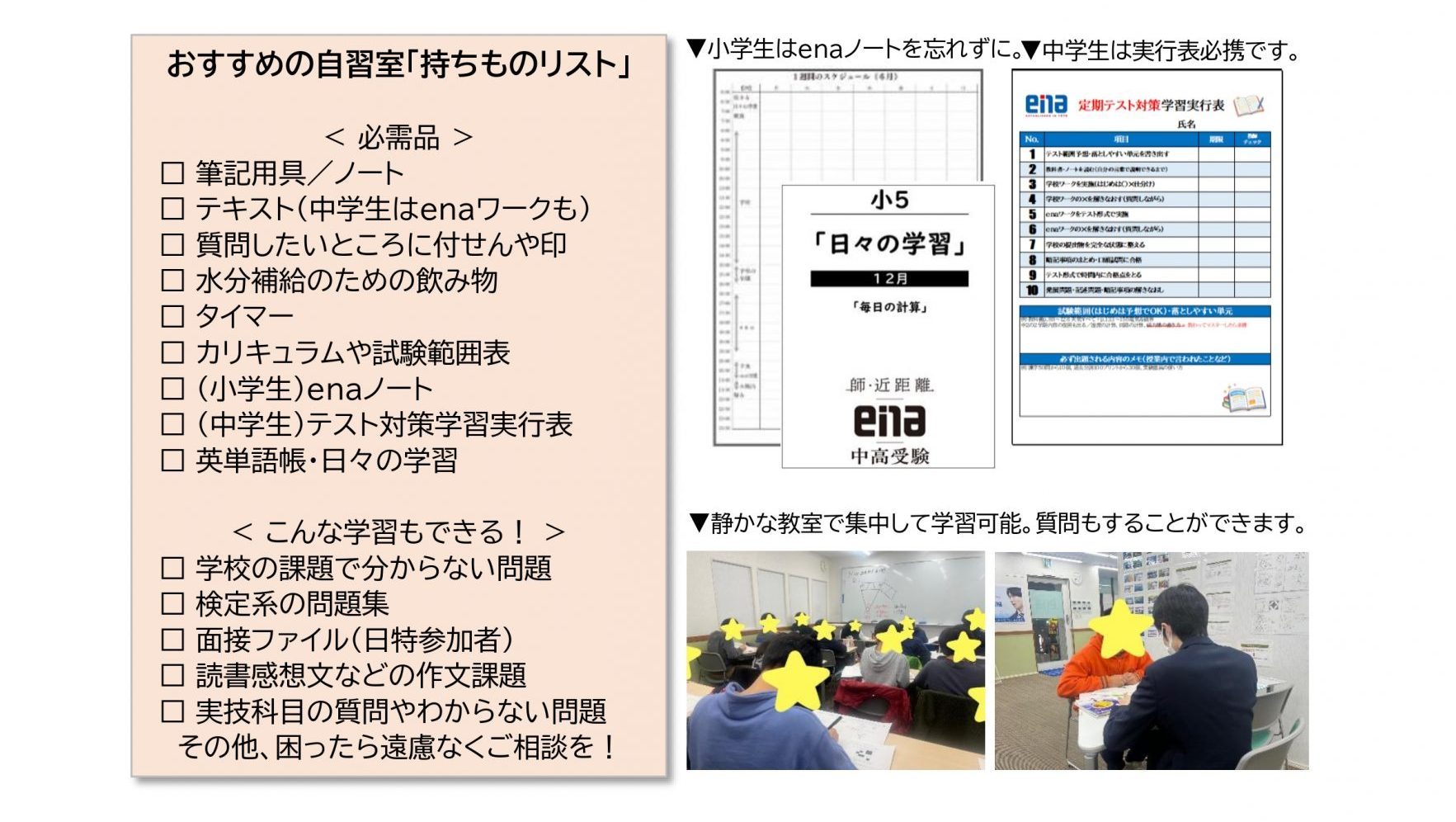 特に「テスト範囲」「enaノート」などは必需品です。