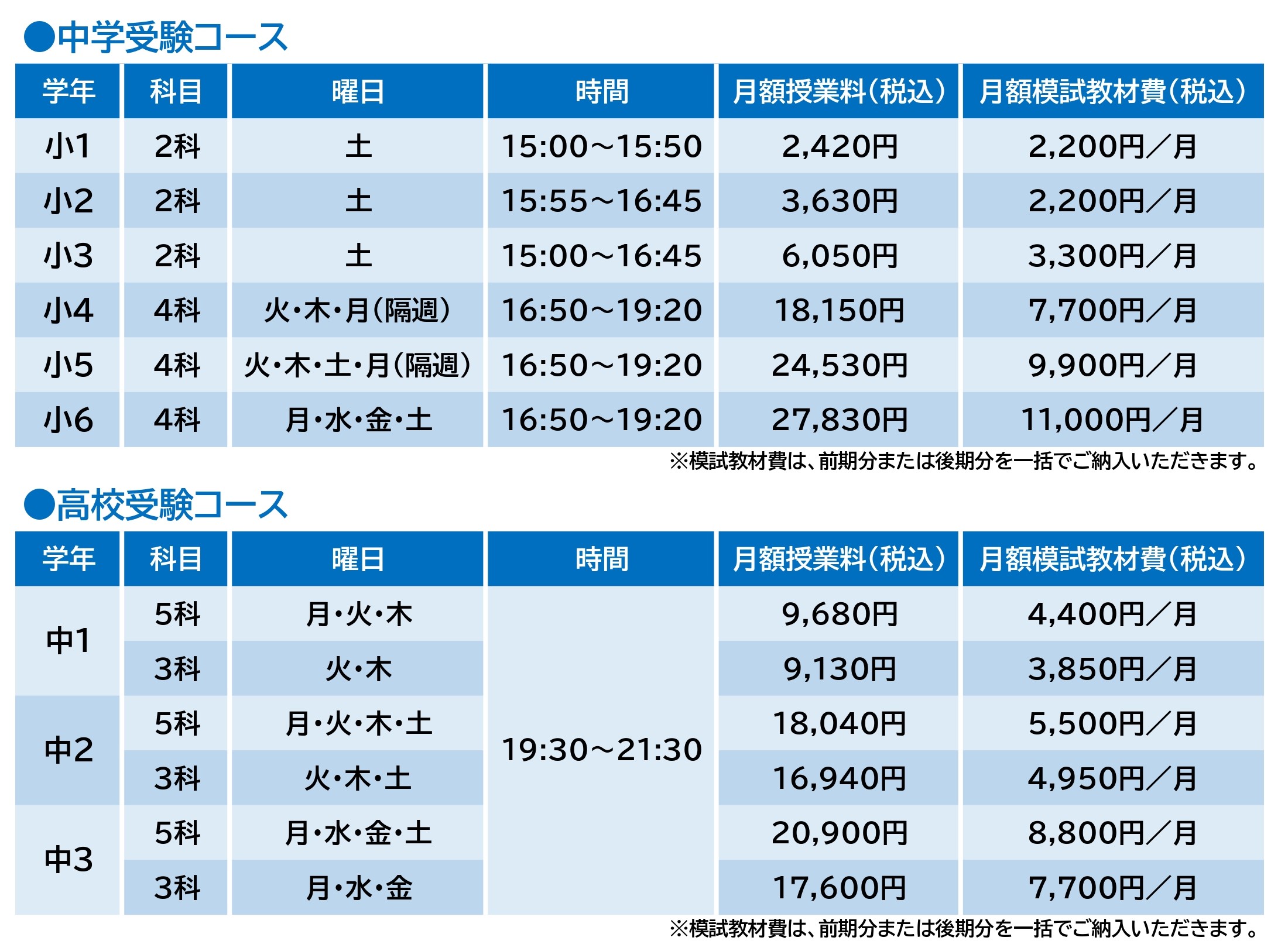 年間を通して通いやすい授業料で、本気の志望校対策を受講できます。ぜひ授業料・学習内容・合格率を比較してください。