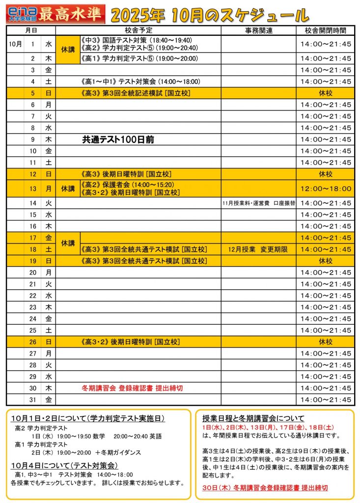 [ena高校部 最高水準吉祥寺] 10月のスケジュール