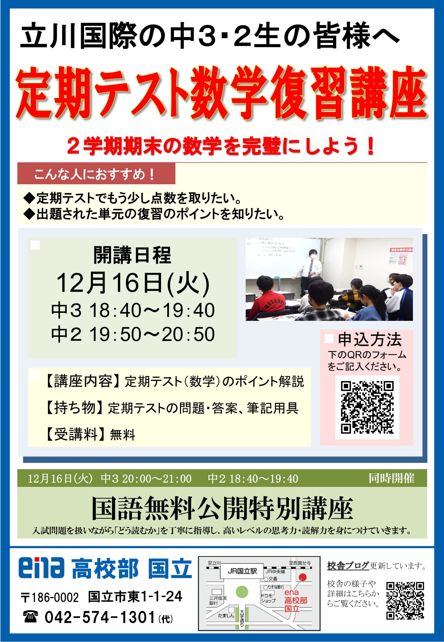 [ena高校部 国立] 本科授業・特訓の週間スケジュール(12/8~)