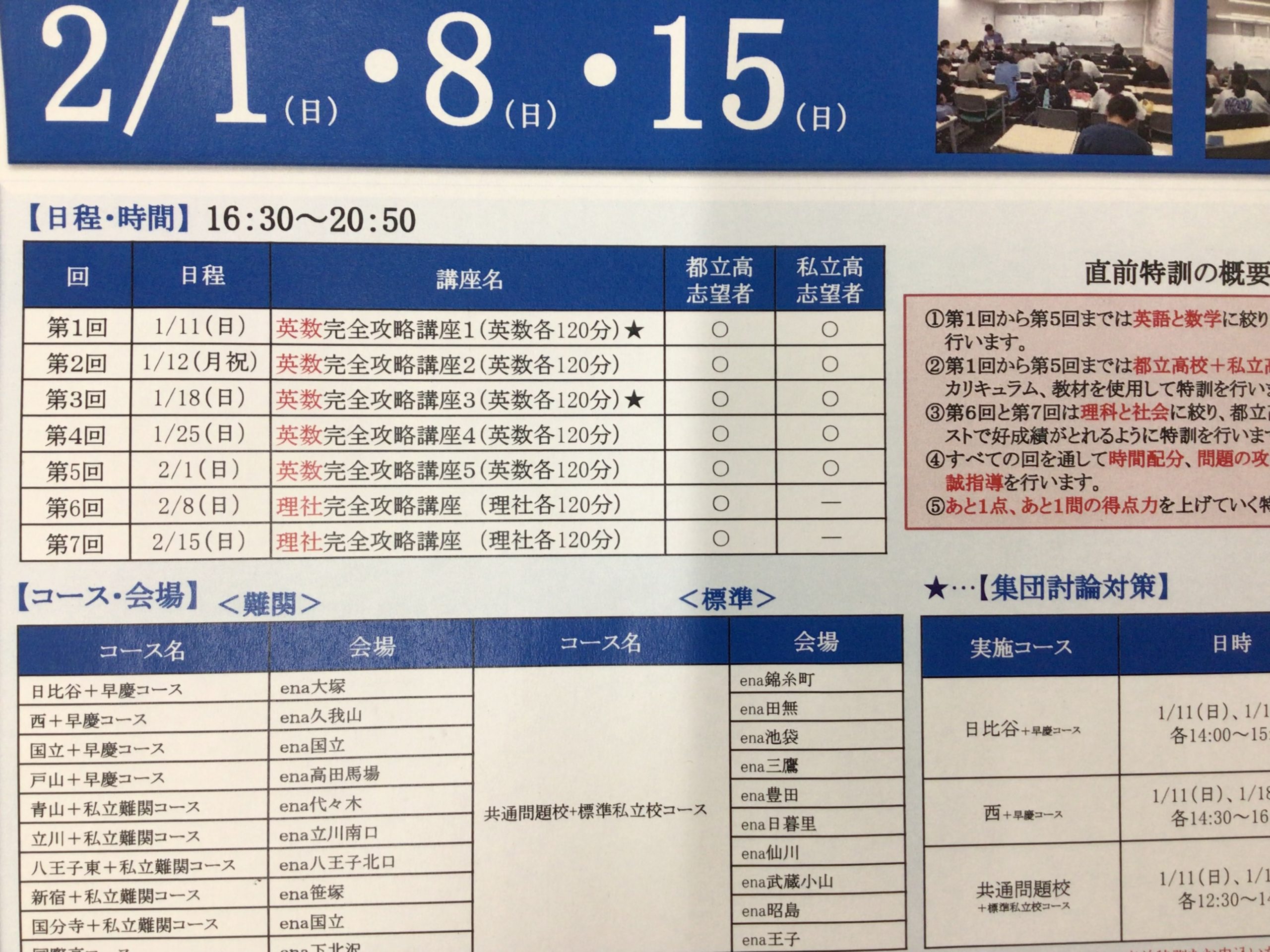 今「不安だな」と感じた生徒は直前特訓に来てください。2/8、2/15の2回で4時間ずつ理社を学べます。