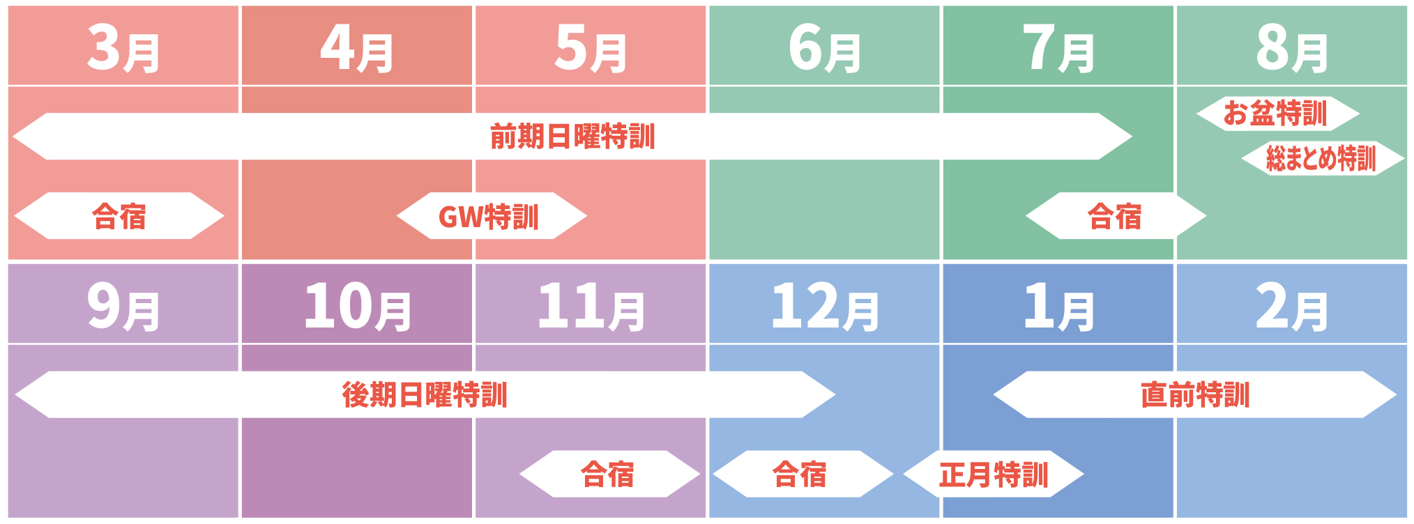 また講習会、特訓や合宿で合格を勝ち取るための十分な学習量を確保いたします。