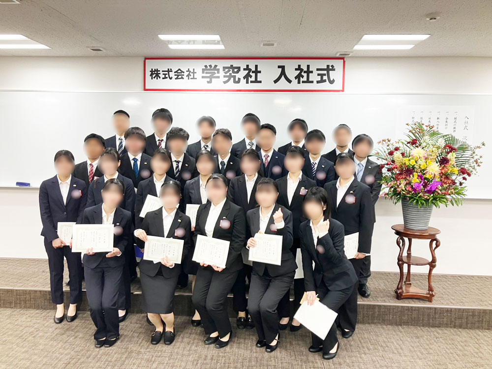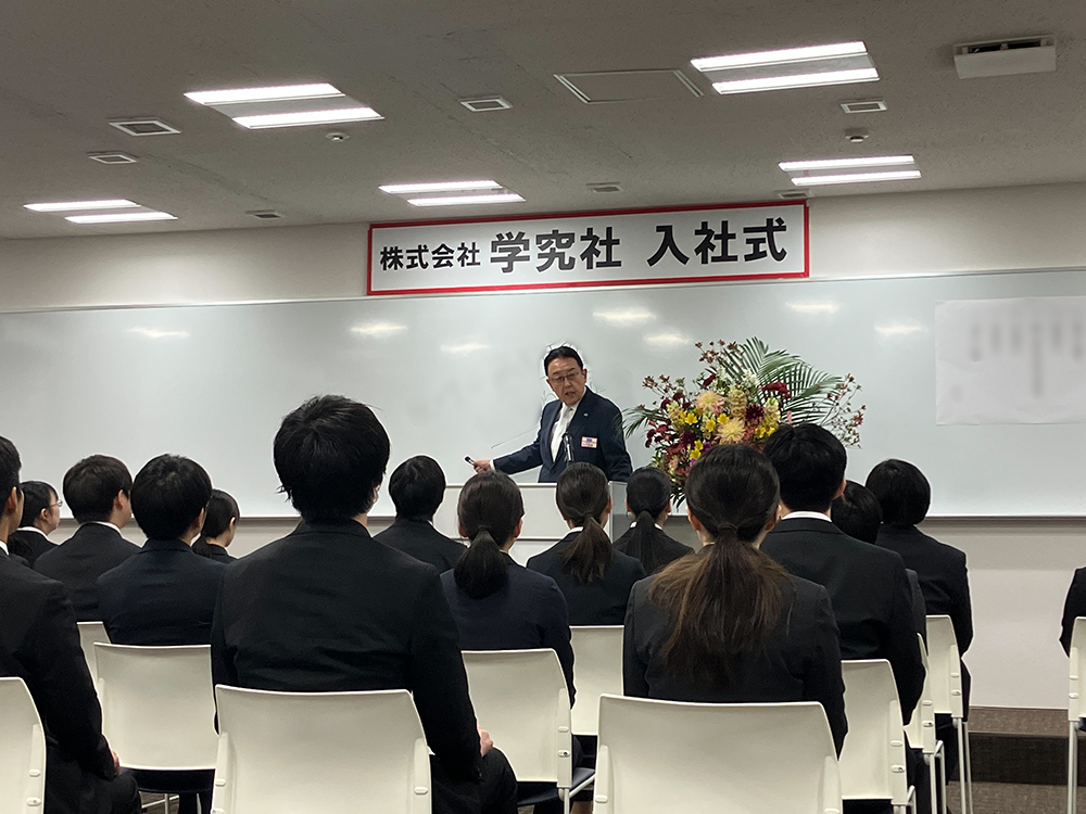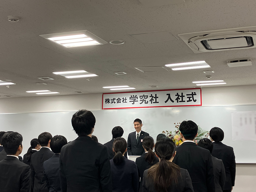 2026年度の入社式を執り行い、新入社員を迎えました。学院長のご挨拶のもと、決意を新たに社会人としての一歩を踏み出しました。